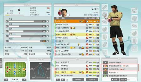 再看这里,布冯的综合能力值较低,所以他的续约费用只有100金币。而且这支球队高能力值的球员很少,全队的续约费用也就不